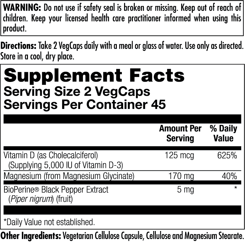Our D-3 Mag Glycinate puts the power of D-3 together with Magnesium Glycinate to offer better support in a VegCap that goes down smoothly. D-3 is known as the “sunshine vitamin” because you can get it naturally from sun exposure, but many don’t get enough of it to enjoy all the benefits. D-3 promotes fortified bones and teeth, while Magnesium Glycinate supports muscle and nerve function. Mag Glycinate helps activate D-3, and together they offer healthy support for your overall health and wellness.