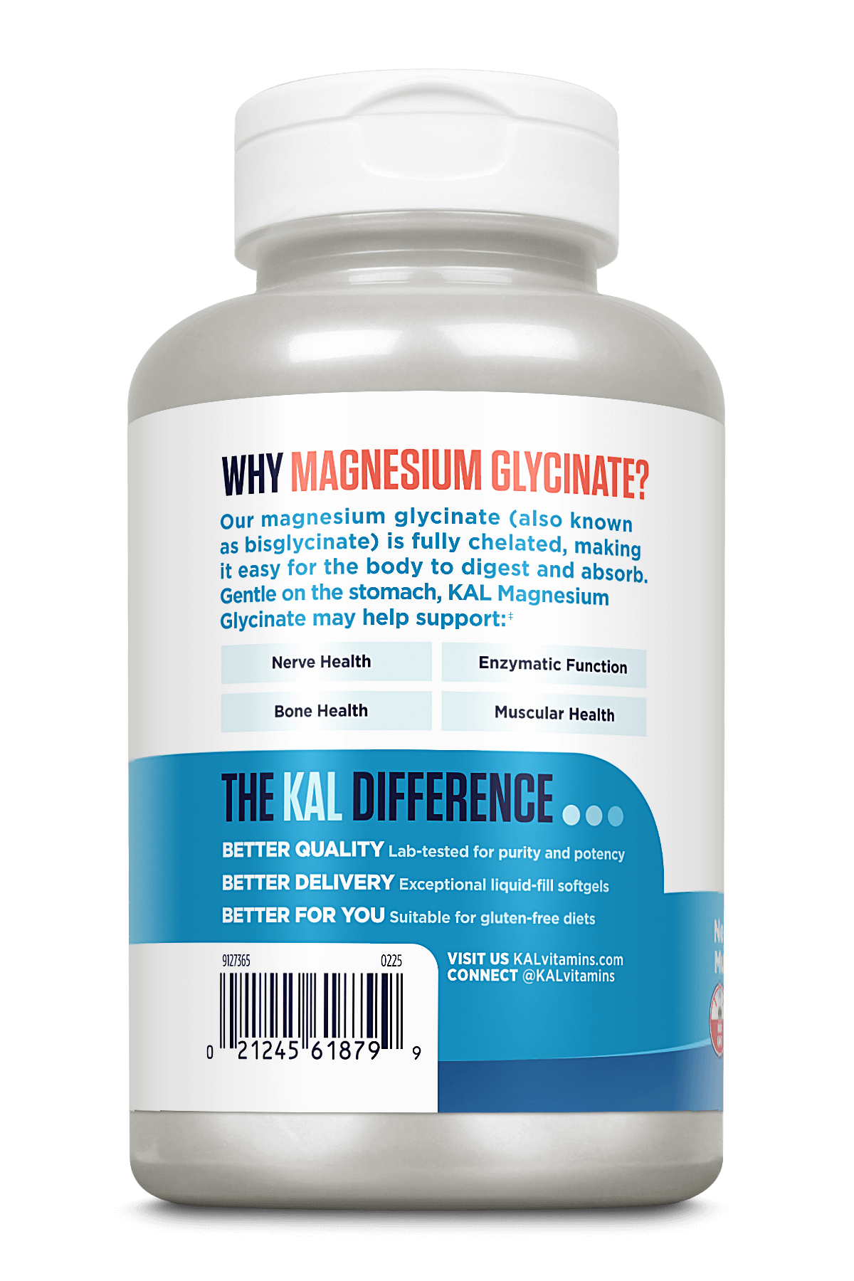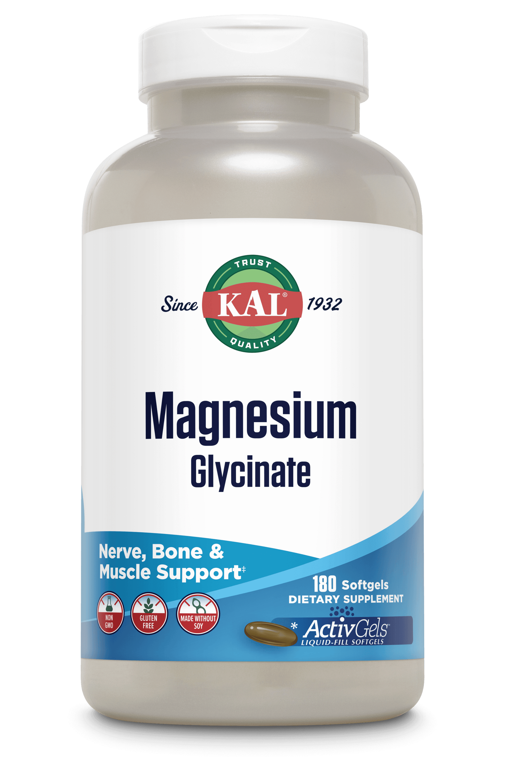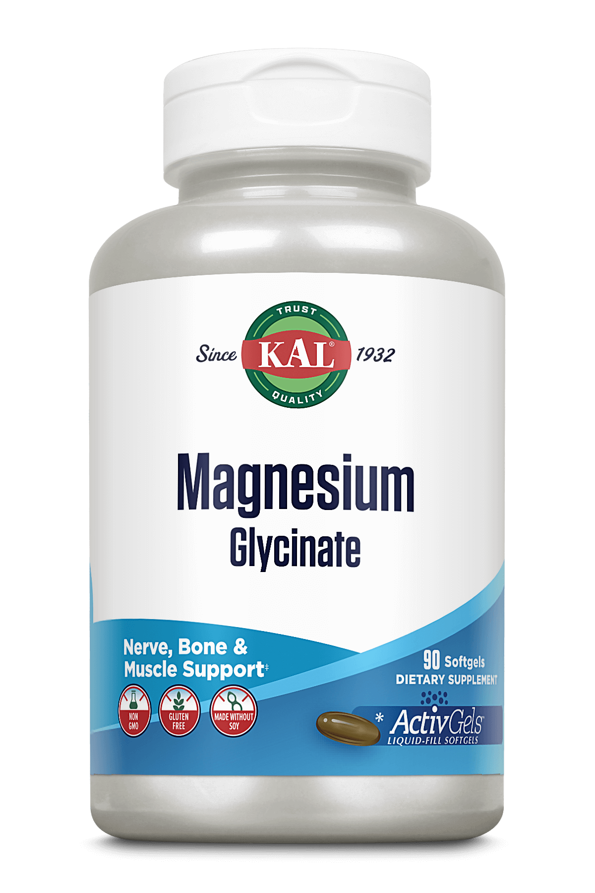 An essential mineral, magnesium is involved in more than 300 enzymatic reactions in the body and plays a role in many vital functions. KAL’s Magnesium Glycinate ActivGels™ is chelated with glycine, making them more bioavailable for efficacious absorption. Magnesium Glycinate works to support healthy nerve function, bone health, and muscles, as well as provide relaxation support.