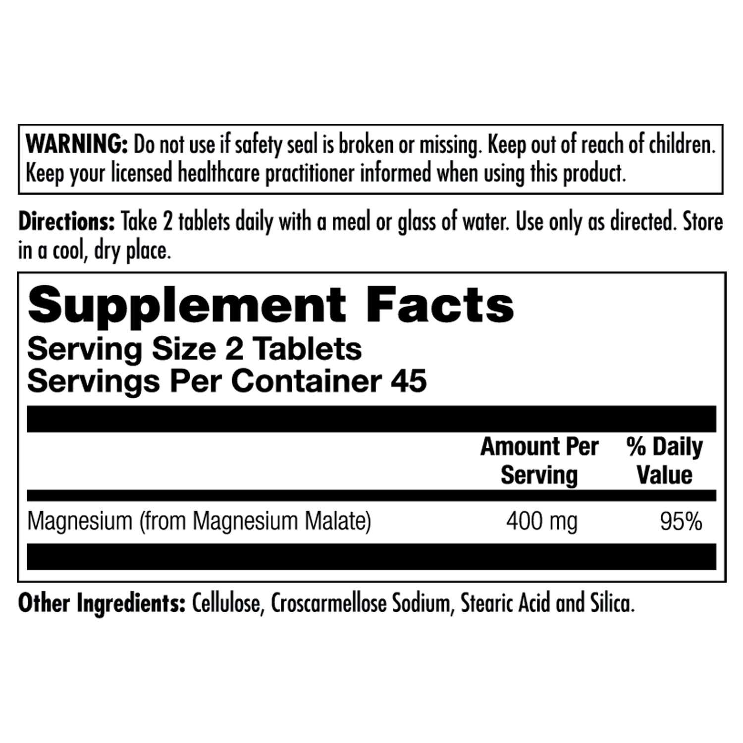 Produced in our own facility, KAL Magnesium Malate is made by reacting the mineral Magnesium with Malic Acid. Malate is a key nutrient in the Krebs cycle. This meticulous process produces high-quality Magnesium, chelated and highly bioavailable. KAL Magnesium Malate 400 tablets provide 400 mg Magnesium per serving (2 tablets).