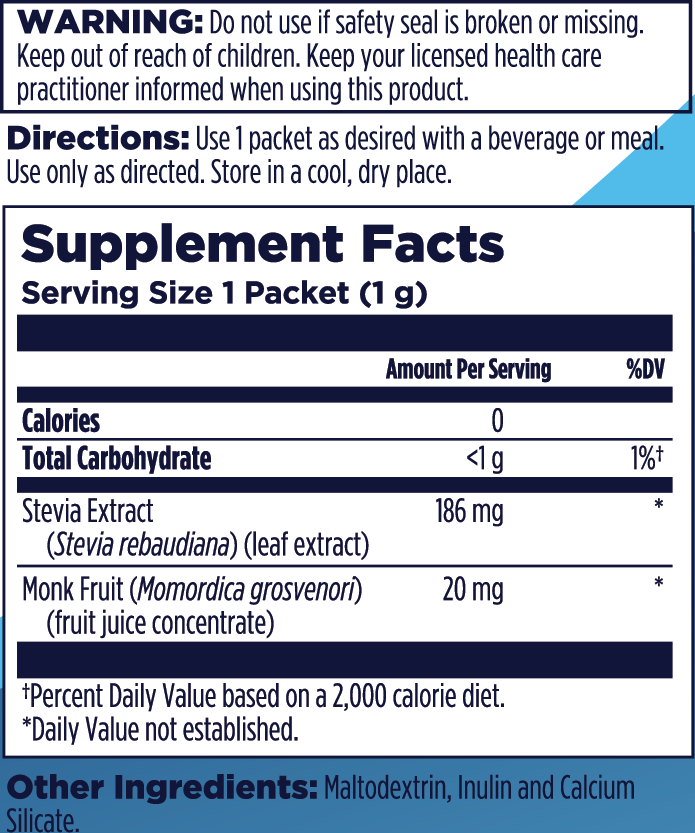 Sure Stevia Extract Powder Plus Monk Fruit can be used in everything from tea, cocoa and lattes to your favorite cookie or cupcake recipes. For convenience, our Sure Stevia Extract Powder Plus Monk Fruit comes in 100 single-serve packets.
